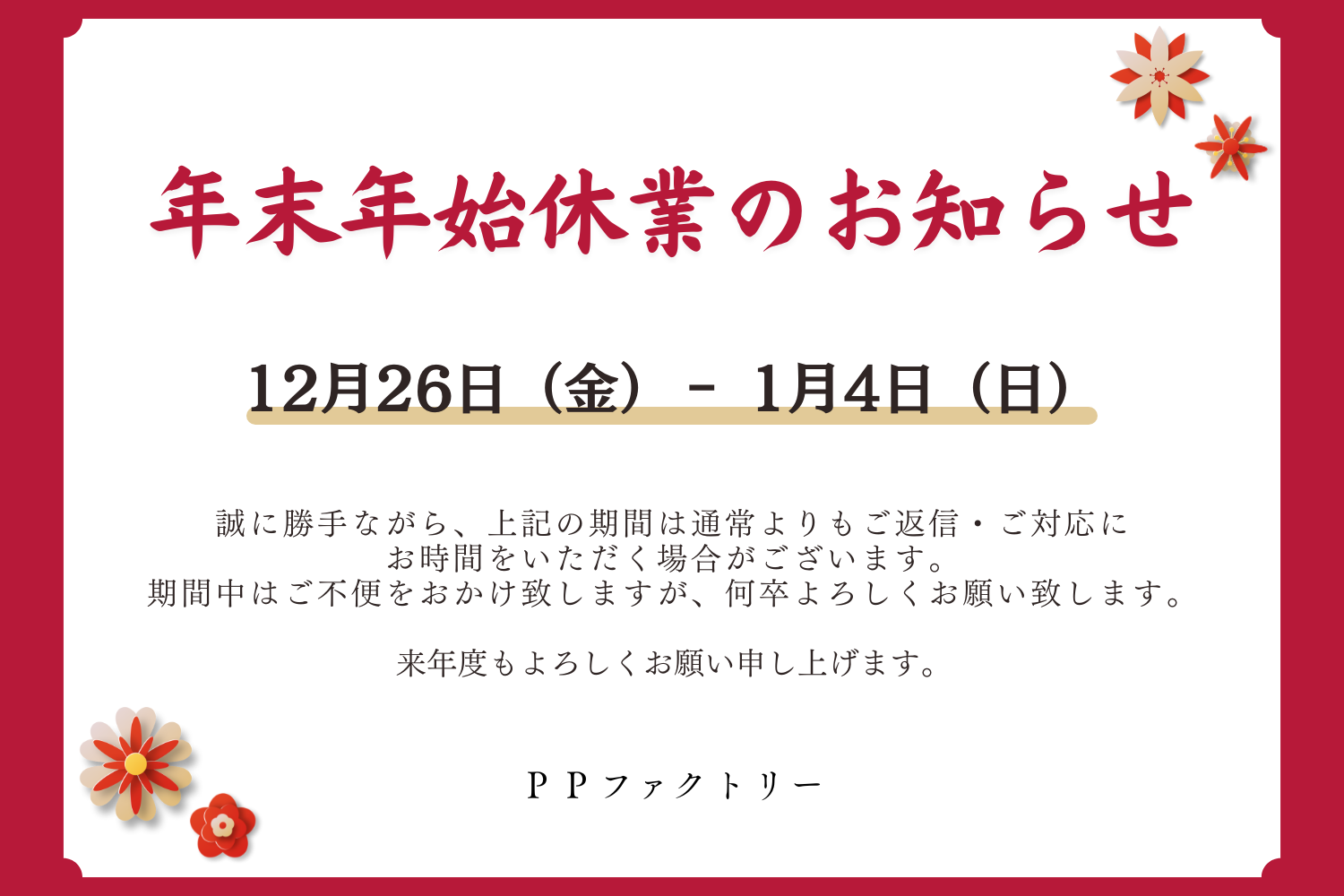下記の期間中は、年末年始休業体制のため通常よりもご返信・ご対応にお時間をいただく場合がございます。
