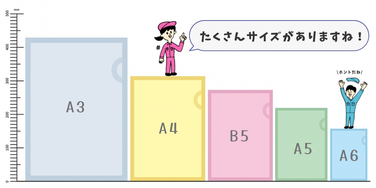 クリアファイルは種類が多いので、用途に応じて最適なサイズを選ぶことが大切です。サイズに関しては、特注での製造も可能ですので、オリジナルのサイズを必要に応じてご相談ください。
