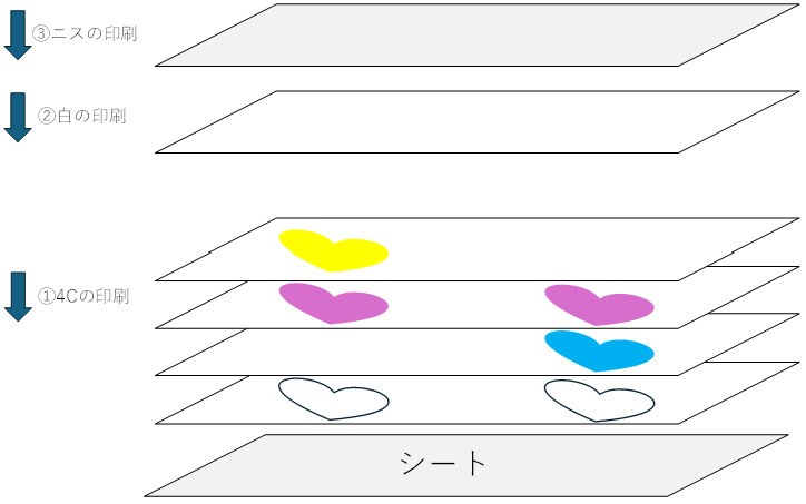 プロセスカラー4C(CMYK)→白→ニスの順番で印刷し、