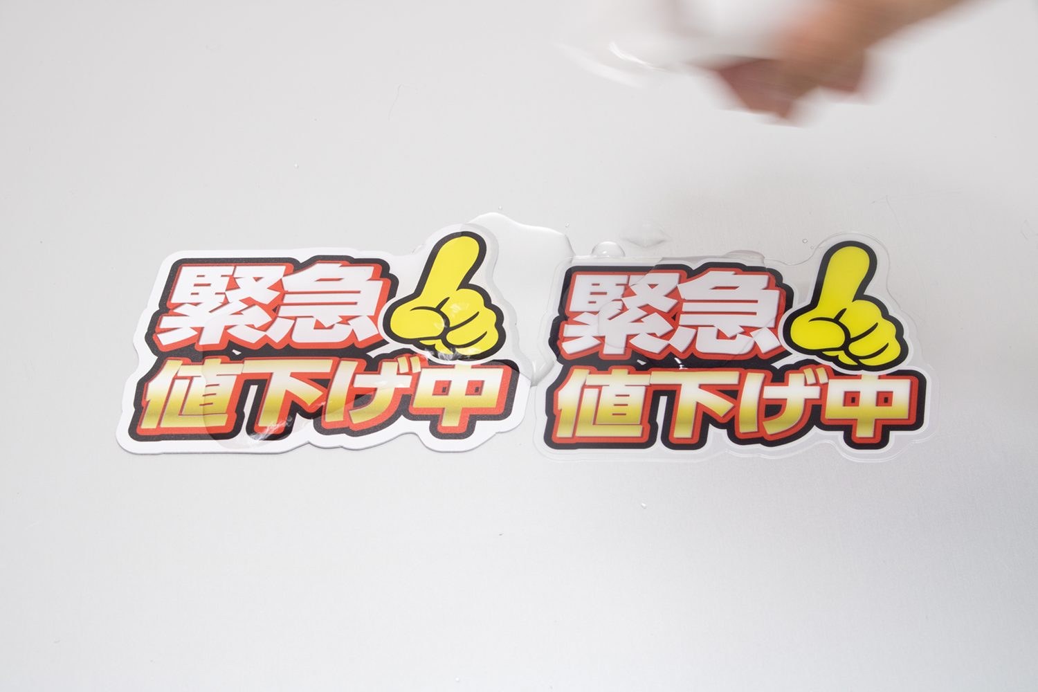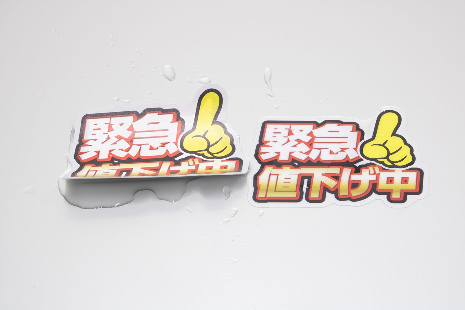 水をかけて3分ほど経過した状態です。紙製POPのほうはカールし始めてますね。
