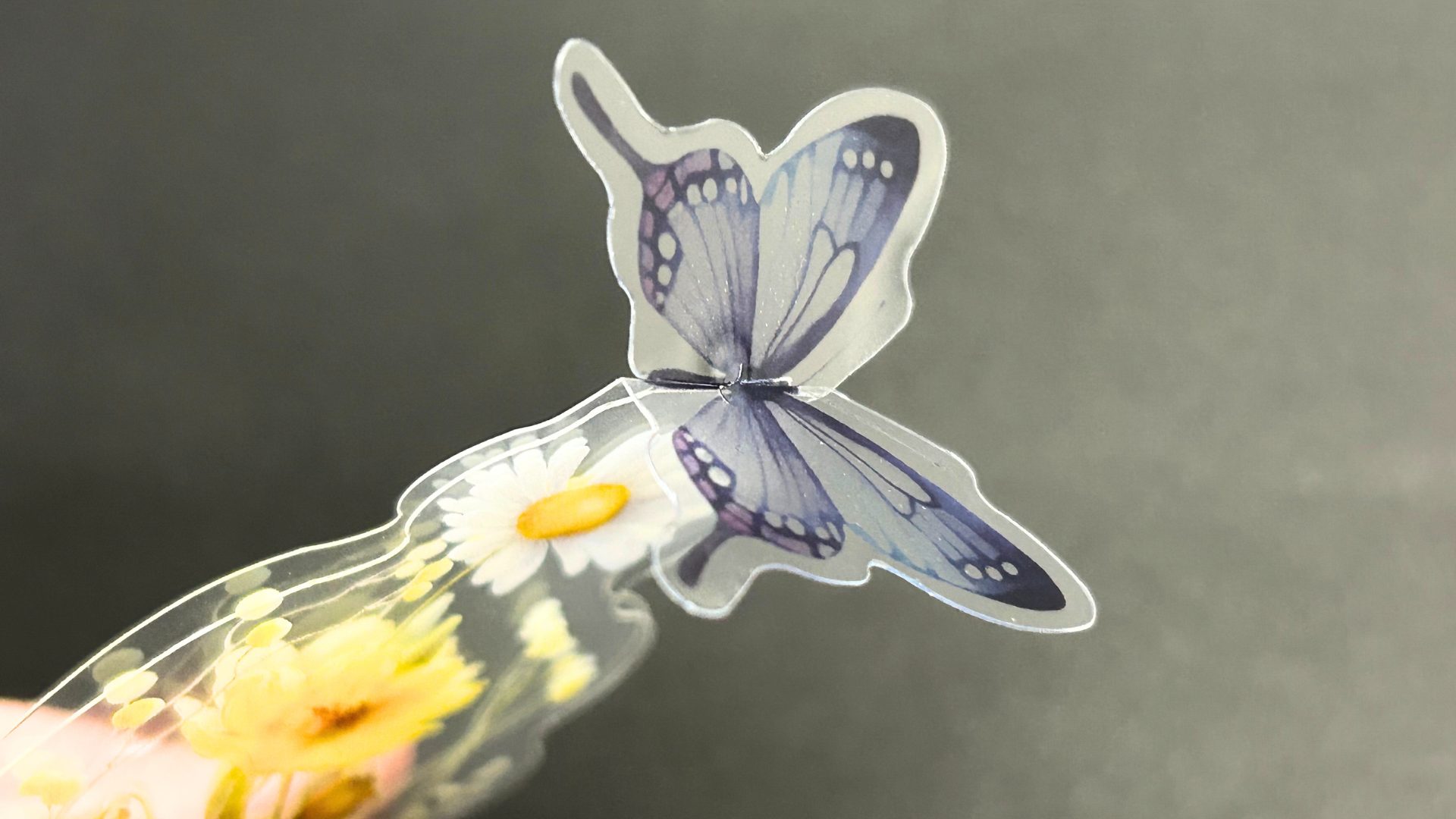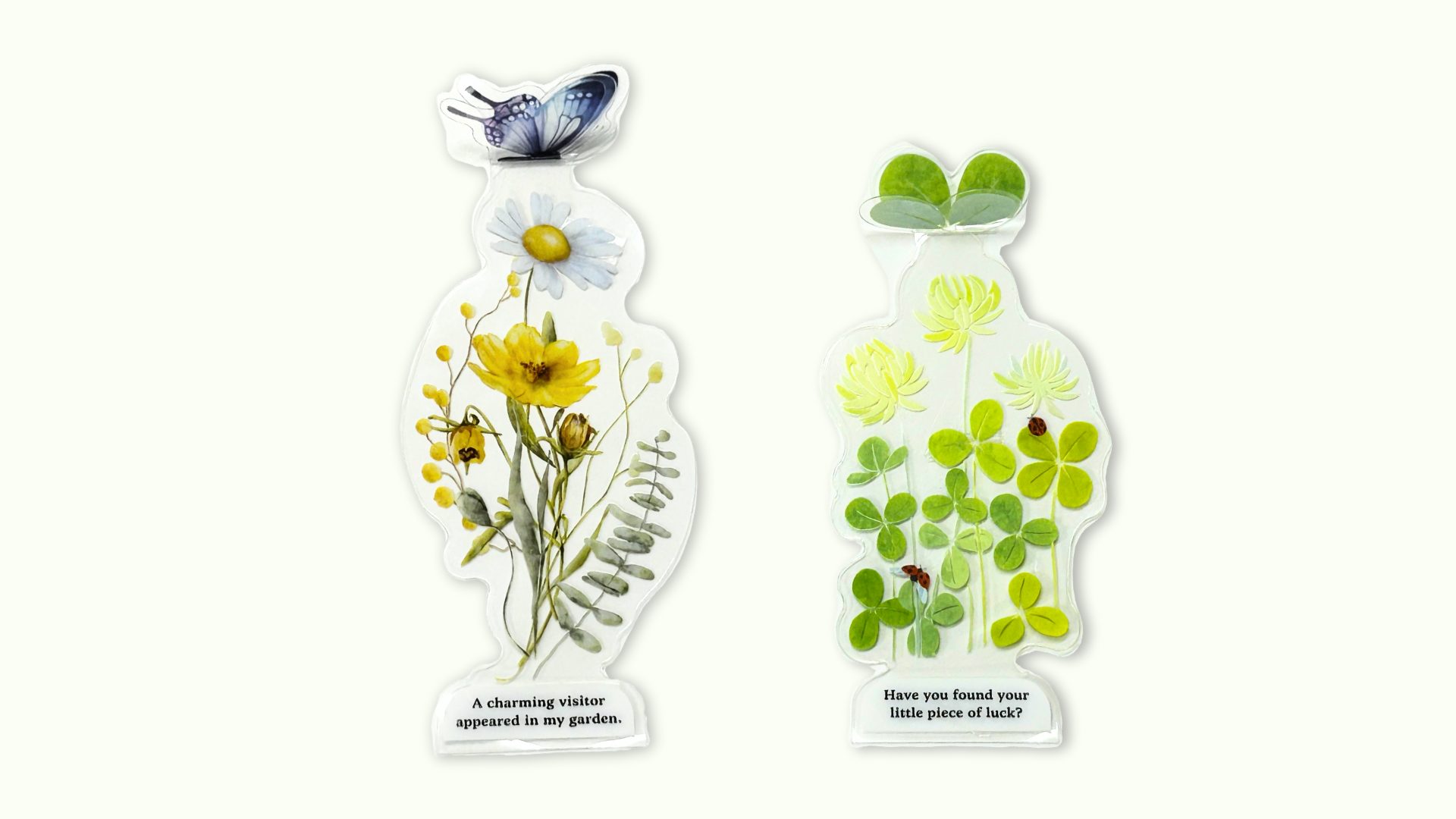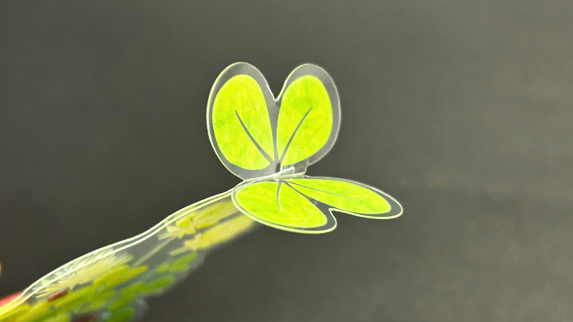 半分に折って、上の切れ込みに差し込むとちょうちょやクローバーが立ち上がる“立体しおり”。