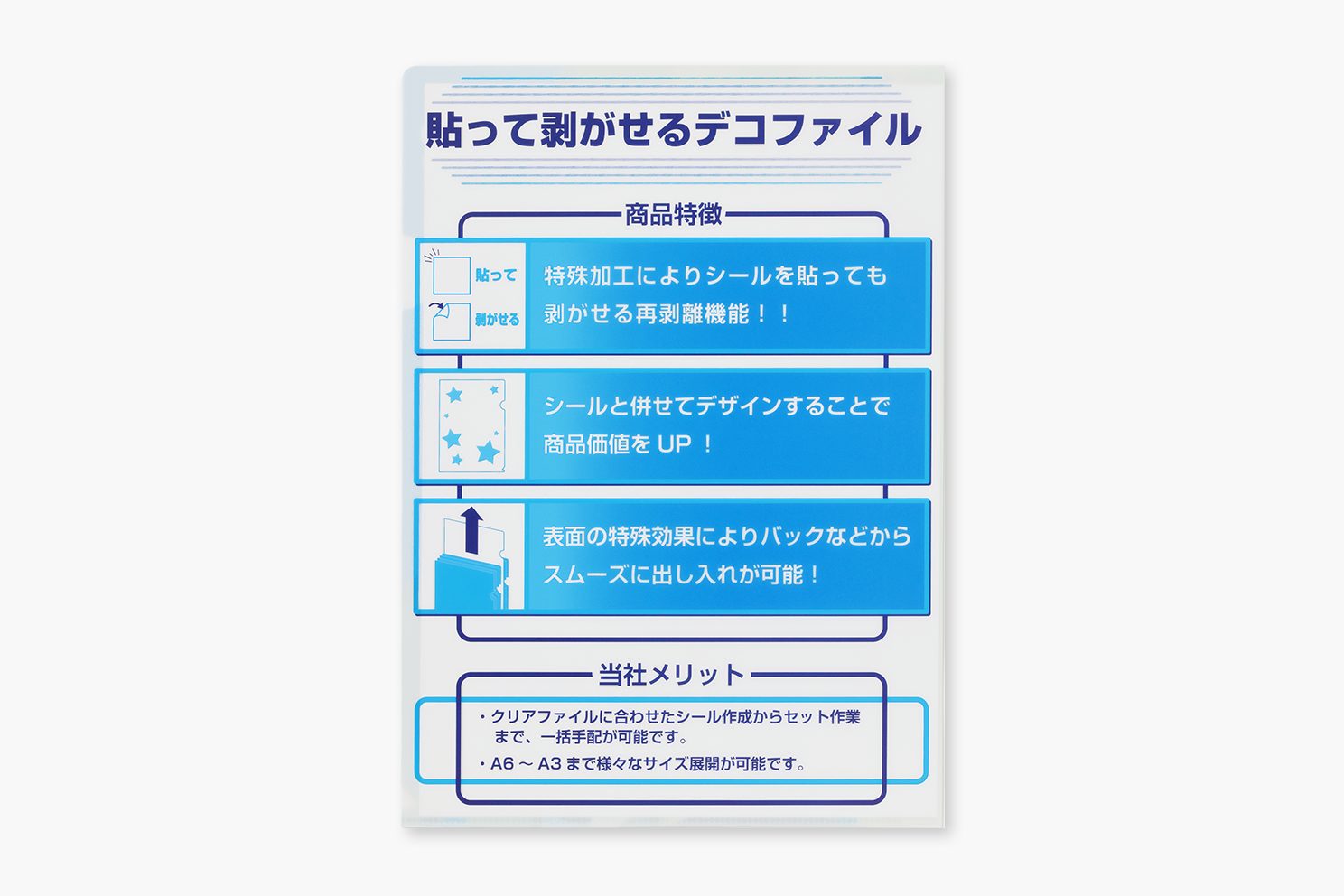 通常、クリアファイルにはキズ・擦れ防止のためにニスを引きます。今回は特殊ニスを引くことにより、キズ・擦れ防止に加えて再剥離機能を発揮!シールを貼っても簡単に剥がせることができ、何度でも楽しめます。