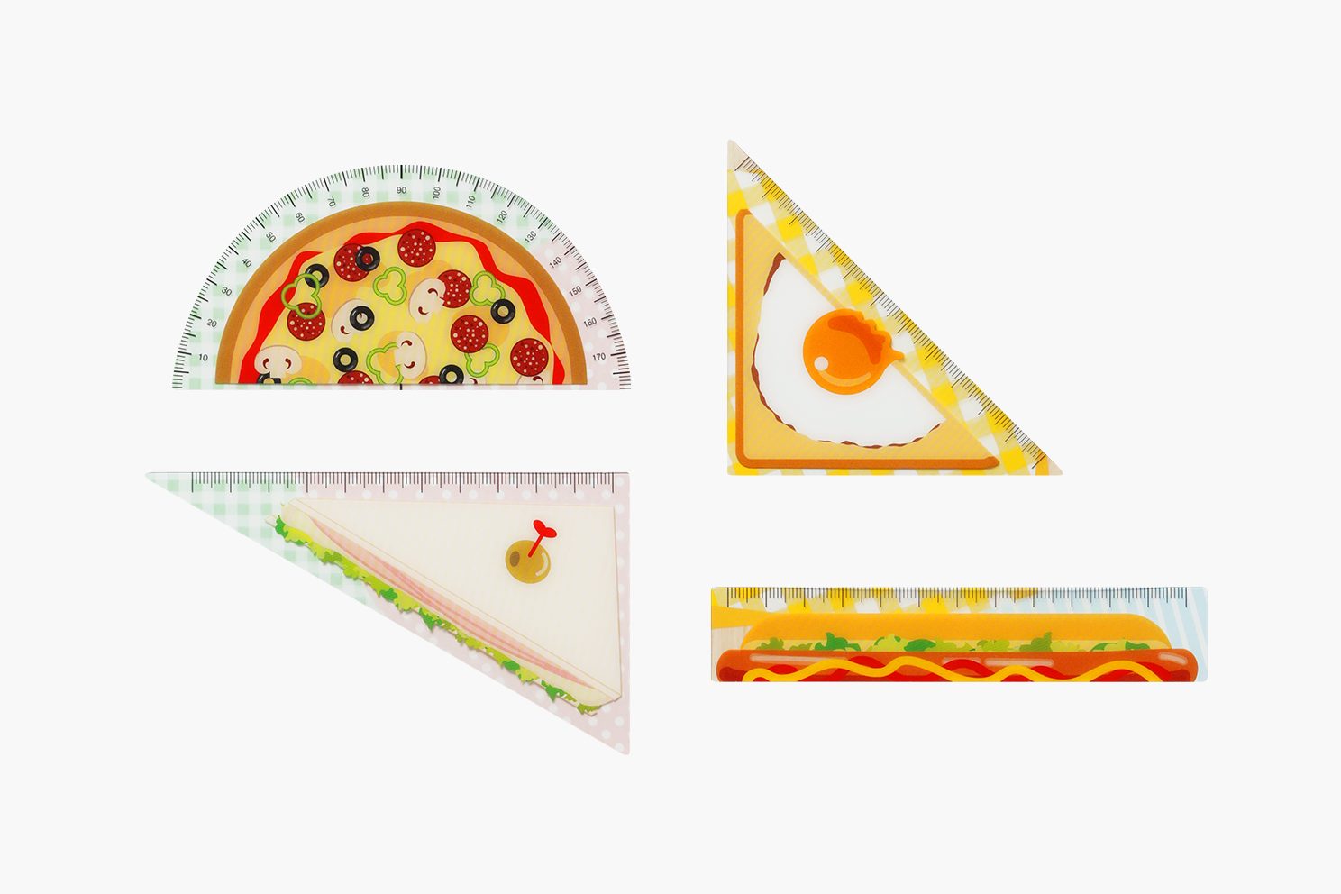 三角定規や分度器、定規がセットされた文具セットシートです。